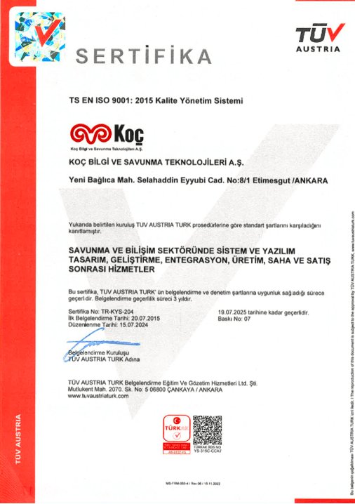 KoçSavunma, kurulduğu tarihten itibaren, ISO 9001 Kalite Yönetim Sistemi standardı esaslarına göre oluşturulmuş süreç mimarisine göre çalışıyor. Tüm uygulamalarını, bu doğrultuda gerçekleştiriyor.